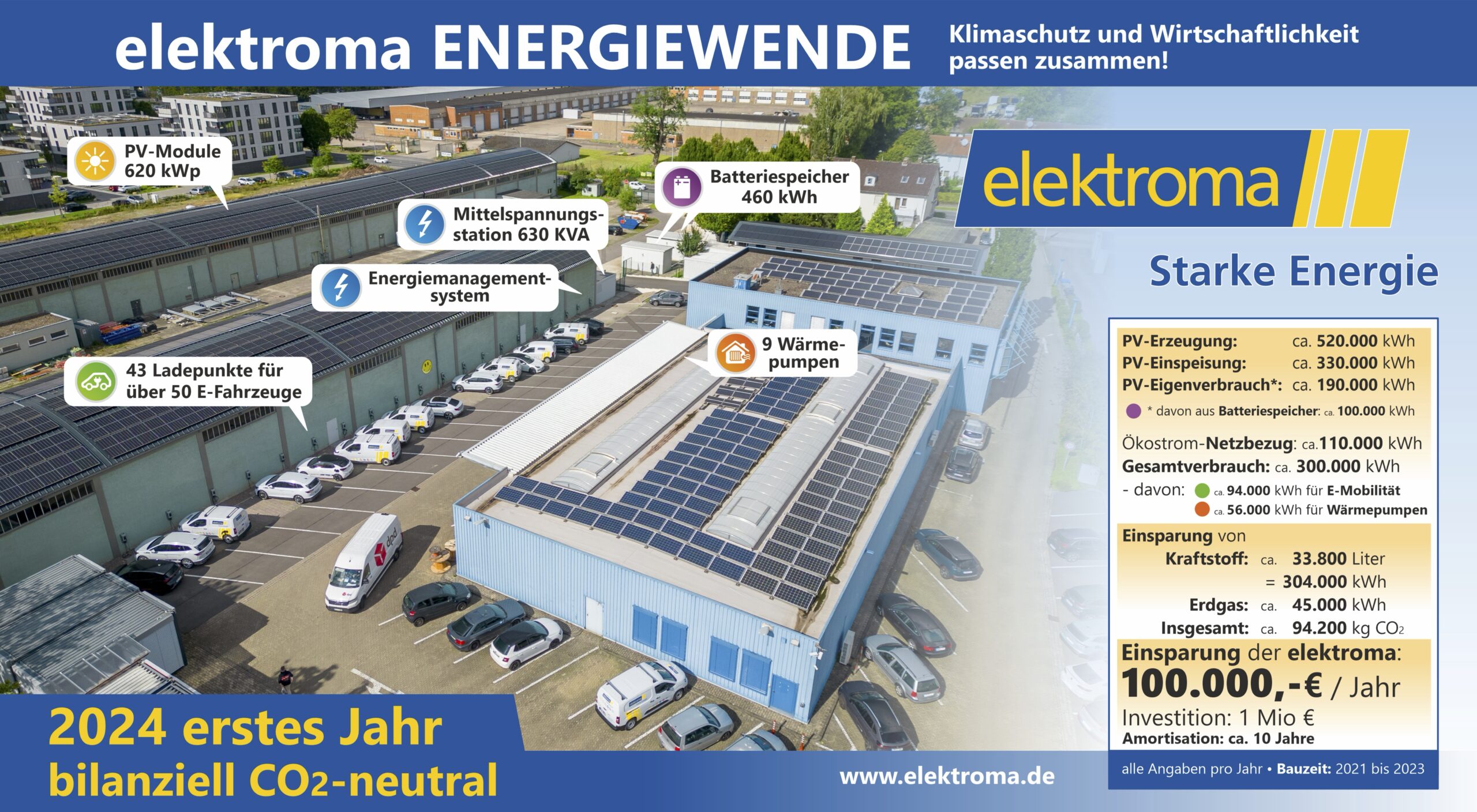 Mit der Entscheidung zur konsequenten Umsetzung der Energiewende auf dem eigenen Betriebsgelände hat elektroma ein starkes Zeichen für eine zukunftsorientierte und verantwortungsvolle Unternehmensführung gesetzt. Wir haben es geschafft im Jahr 2024 das erste Mal bilanziell CO2 neutral zu wirtschaften.